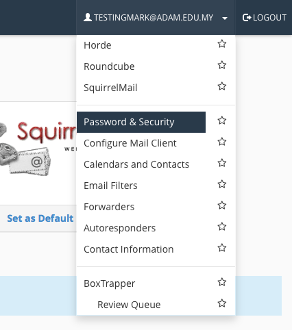 1. Pergi ke https://example.com/webmail (gantikan example.com dengan laman web anda) 2. Log masuk ke e-mel anda. 3. Jangan klik pada RoundCube, Squirrel atau Hordes. 4. Pergi ke sudut kanan atas. Cari e-mel anda. 5. Klik pada “Password & Security”.