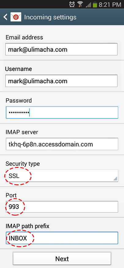 - Alamat E-mel dan Nama Pengguna adalah perkara yang sama. Pelayan IMAP adalah Domain Akses E-mel anda (rujuk e-mel anda) xxxx-xxxx.accessdomain.com